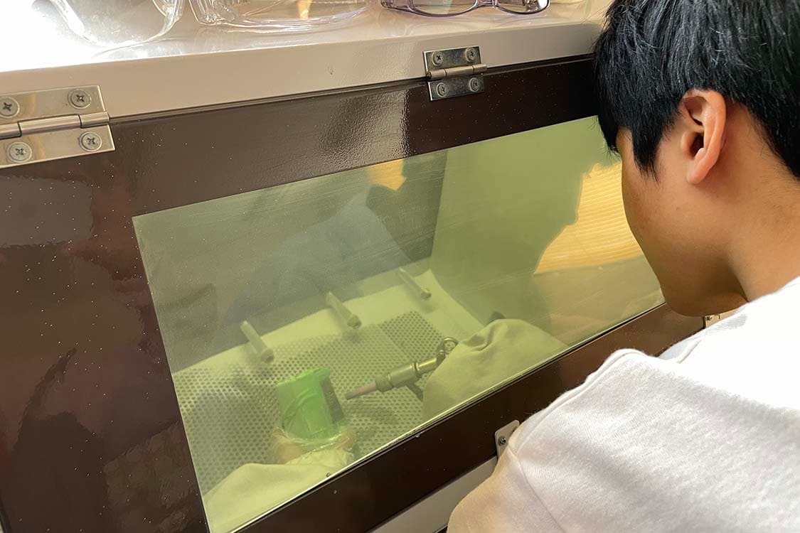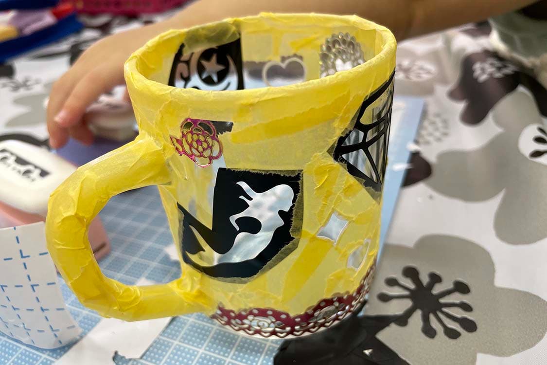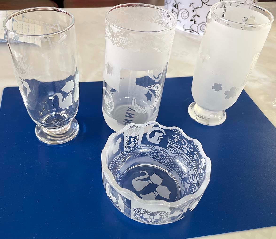西山産業では、石材を加工する技術を活かした体験ができます。「サンドブラストでシルエット彫刻体験」では、ガラスに砂(研磨剤)を吹きかけ、表面をスリガラスに削る技法を用いてオリジナル商品を作ることができます。