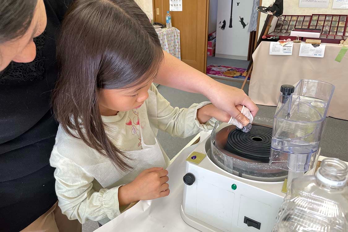 「鉱石磨き体験」は、貴重な原石(ラピスラズリ・アマゾナイト・ガーネット・ローズクォーツ等)の中から好きな鉱石を選んで、専門の機械で磨きあげます(サンドペーパーや鉄やすり等)。本来の魅力的な輝きを引き出しましょう(どんな石でも磨けば光る!)。 体験教室は、ご予約にて承っています。