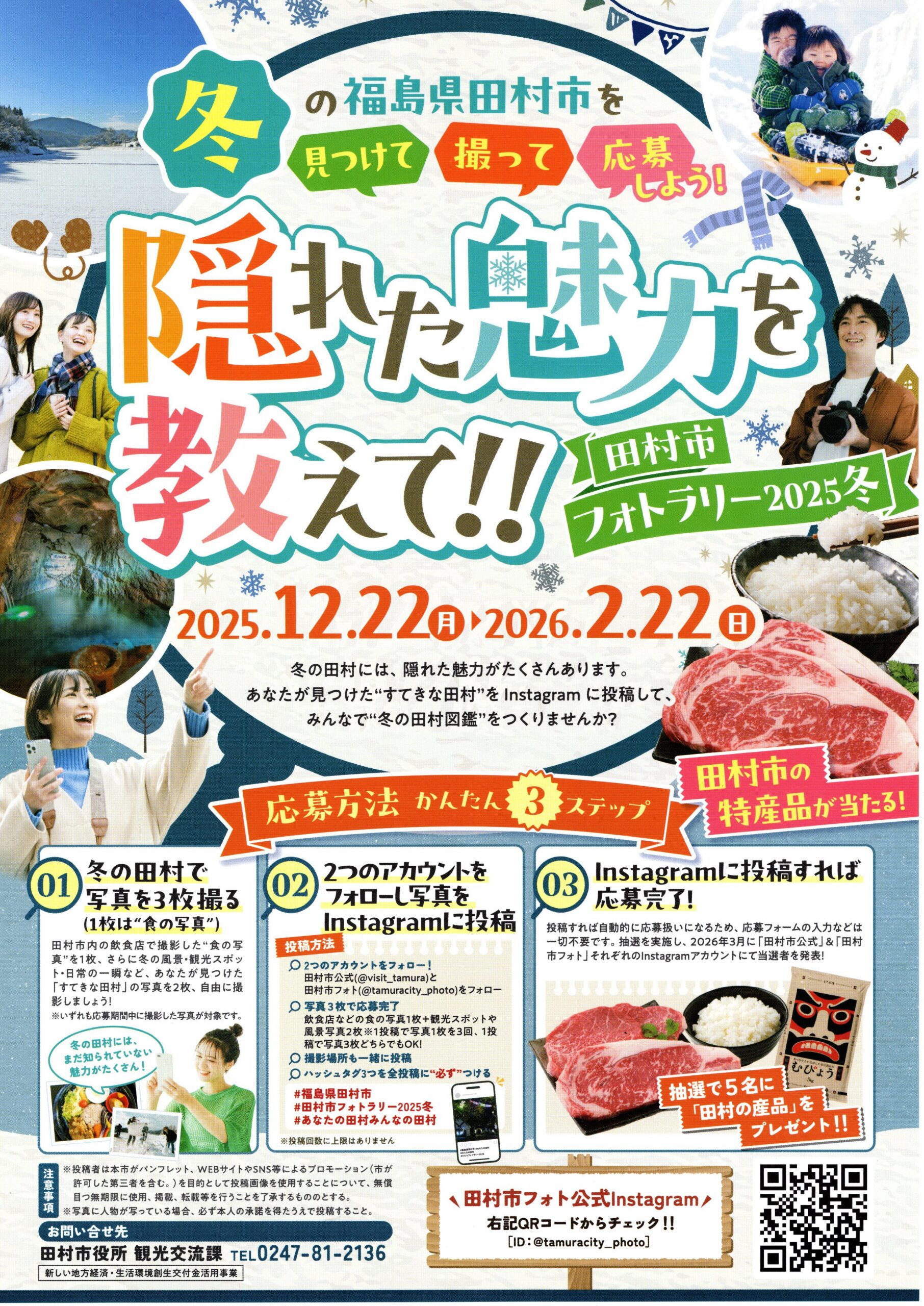 冬季における田村市の魅力発掘と市内の周遊機会の創出を目的に、Instagramを利用したフォトラリーを実施します。どなたでも参加できますので、ぜひご参加ください!