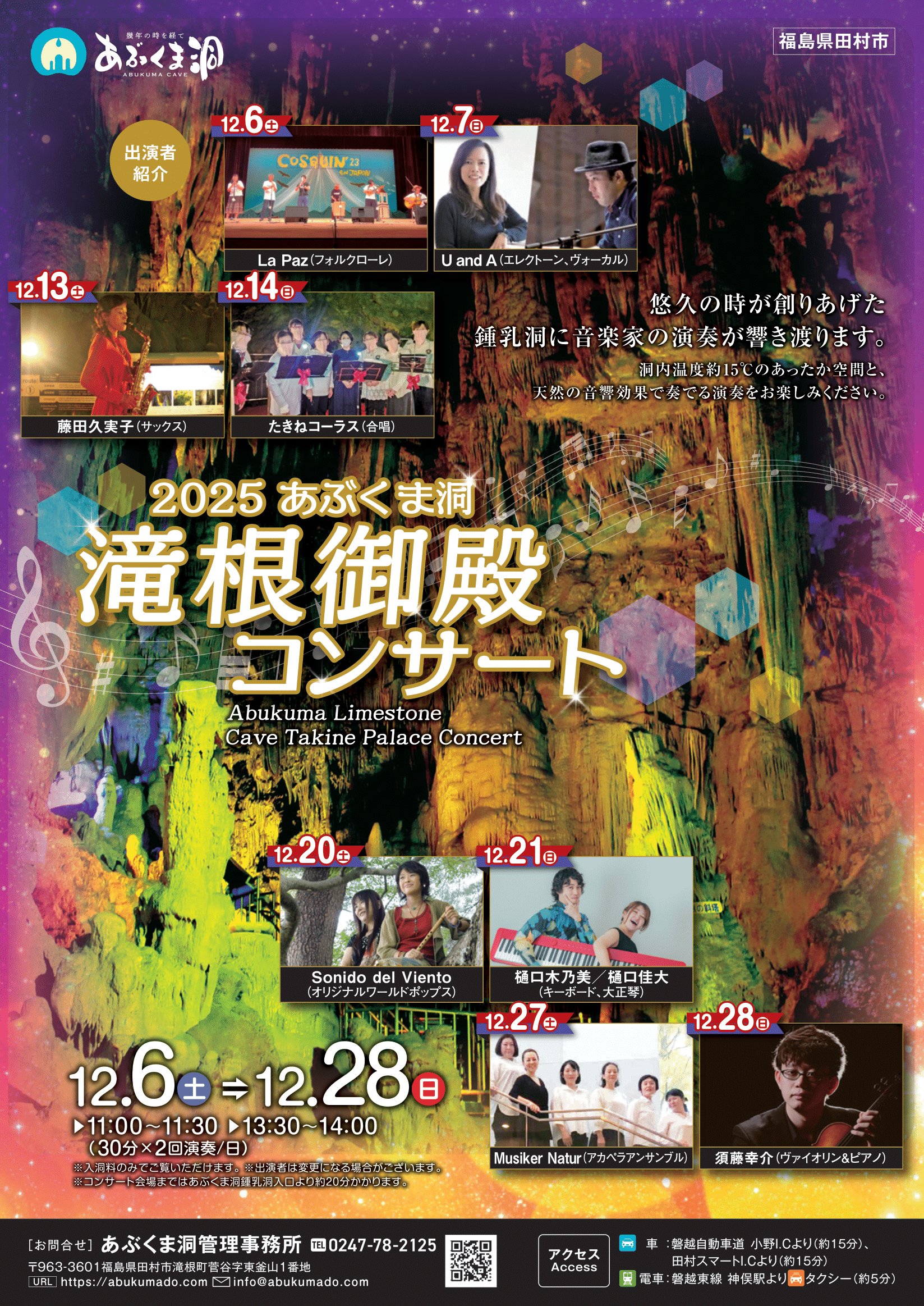 <滝根御殿コンサート> 〇開催日時:2025年12月6日(土)~12月28日(日)1回目11:00~11:30、2回目13:30~14:00(30分×2回演奏/日) 〇開催場所:あぶくま洞(田村市滝根町菅谷東釜山1) 〇入洞料金:高校生以上/1,200円 中学生/800円 小学生/600円 幼児無料 〇お問合せ:あぶくま洞管理事務所(Tel:0247-78-2125) 〇詳しくは:あぶくま洞HP→https://abukumado.com/