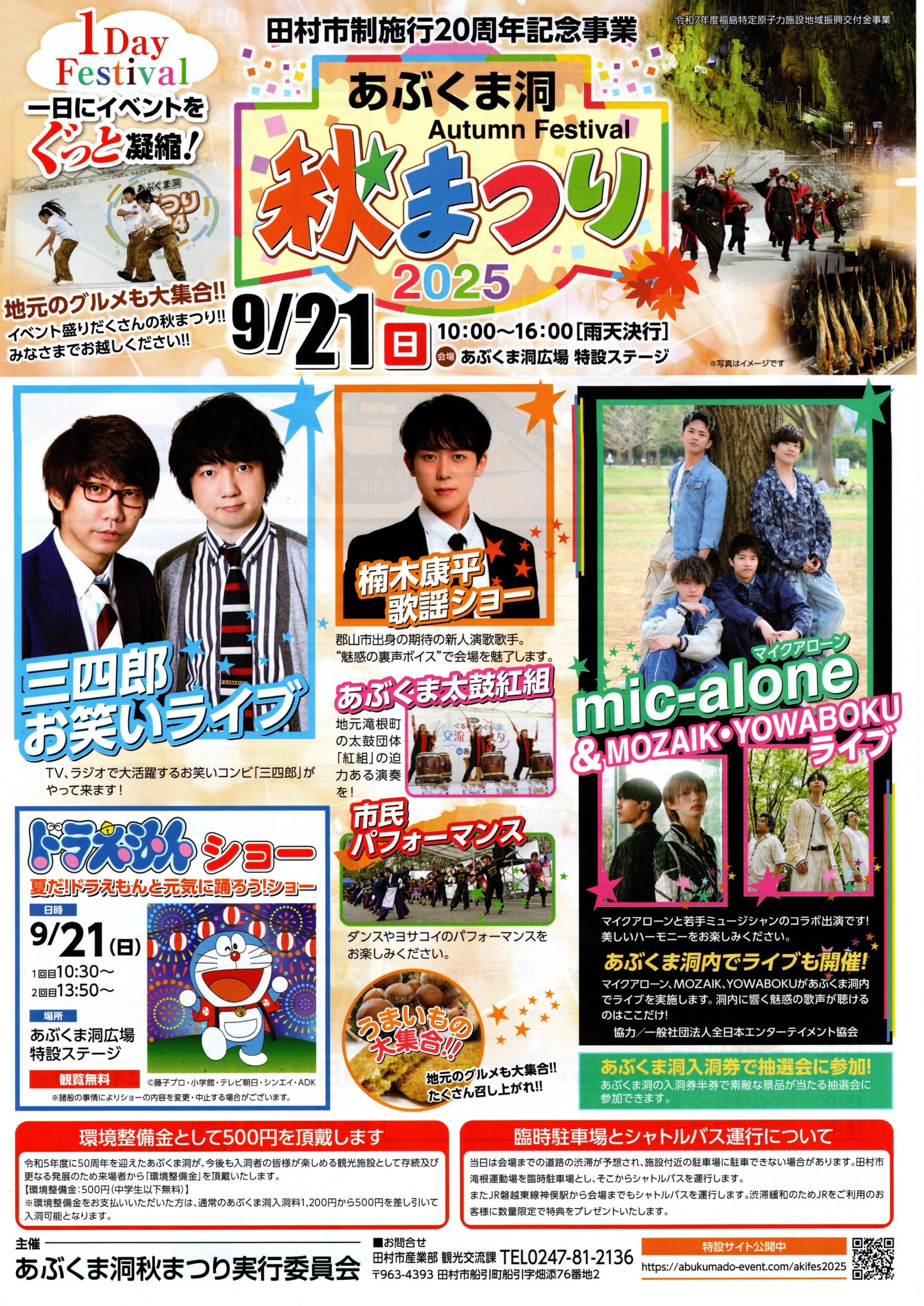 〇日時:2025年9月21(日) 10:00~16:00 〇場所:あぶくま洞広場 特設ステージ(田村市滝根町菅谷字東釜山1) 詳細HP→https://abukumado-event.com/akifes2025/